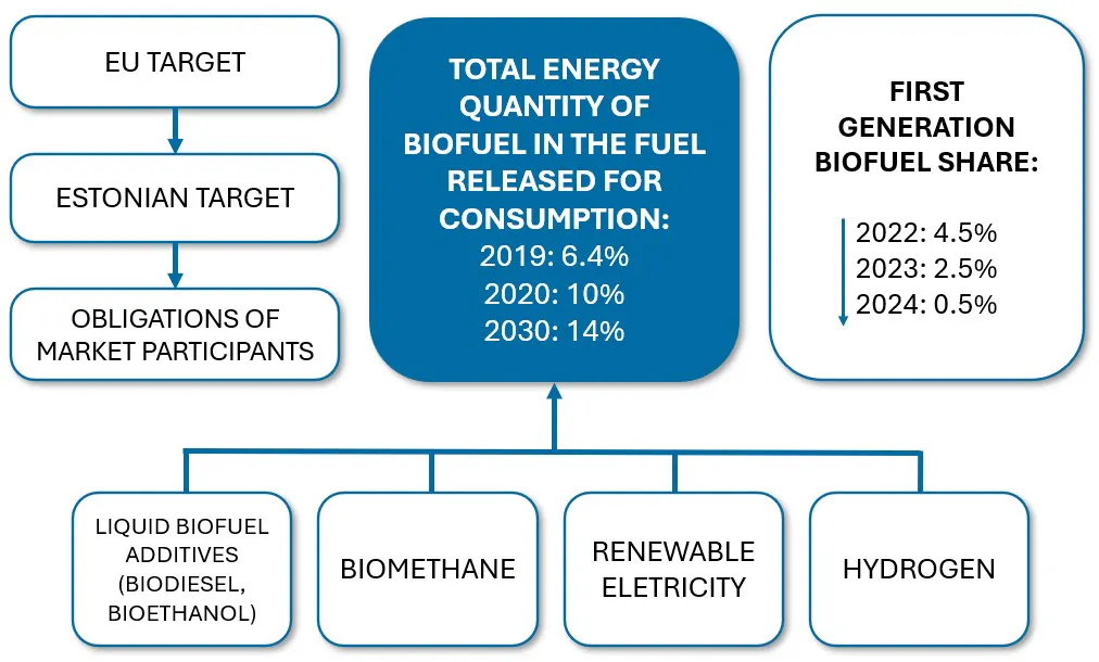 In Estonia, the field is further regulated by the Liquid Fuel Act (VKS) and the Energy Sector Organisation Act (EnKS). In addition, guidance is provided by the Regulation No. 90 of the Minister of Climate of 14.11.2022 “Procedure for Trading in Biofuel, Biomethane and Electricity Statistics and Greenhouse Gas Emission Statistics.”