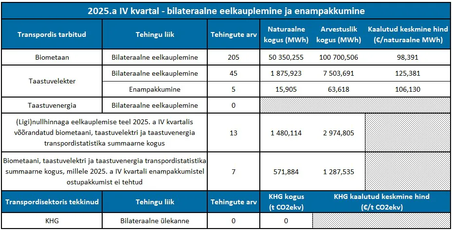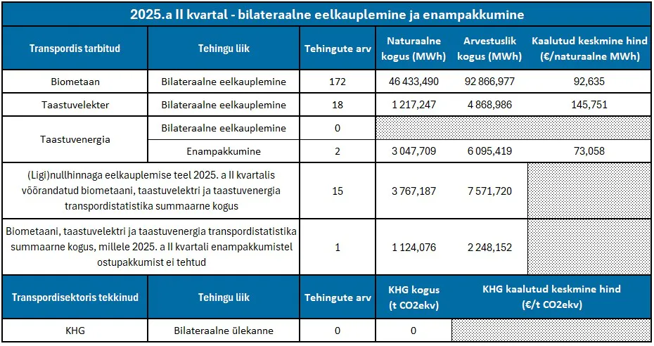 2025. aastal bilateraalse kauplemise ja enampakkumise teel võõrandatud biometaani, taastuvelektri, taastuvenergia ja KHG transpordistatistika kaalutud keskmised müügihinnad: