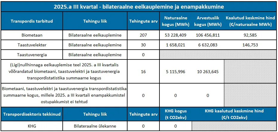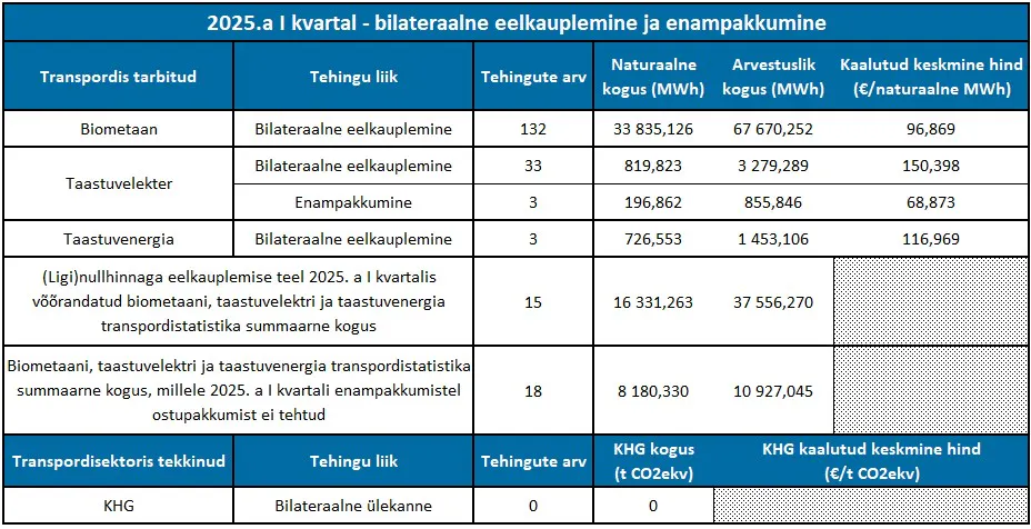 2025. aastal enampakkumise teel I kvartalis taastuvenergia statistikat, II kvartalis taastuvelektri statistikat ja III kvartalis taastuvenergia statistikat, IV kvartalis taastuvenergia ja biometaani statistikat ei võõrandatud. I kvartalis biometaani statistika, II kvartalis biometaani statistika ning III kvartalis taastuvelektri ja biometaani statistika õnnestunud enampakkumisi ei toimunud piisavalt andmete avaldamiseks (tulenevalt arvutuste metoodikast ei avaldata kvartalite keskmiste müügihindade ülevaadetes transpordistatistika liikide lõikes andmeid kui valim sisaldab ainult ühe tehingu andmeid).
